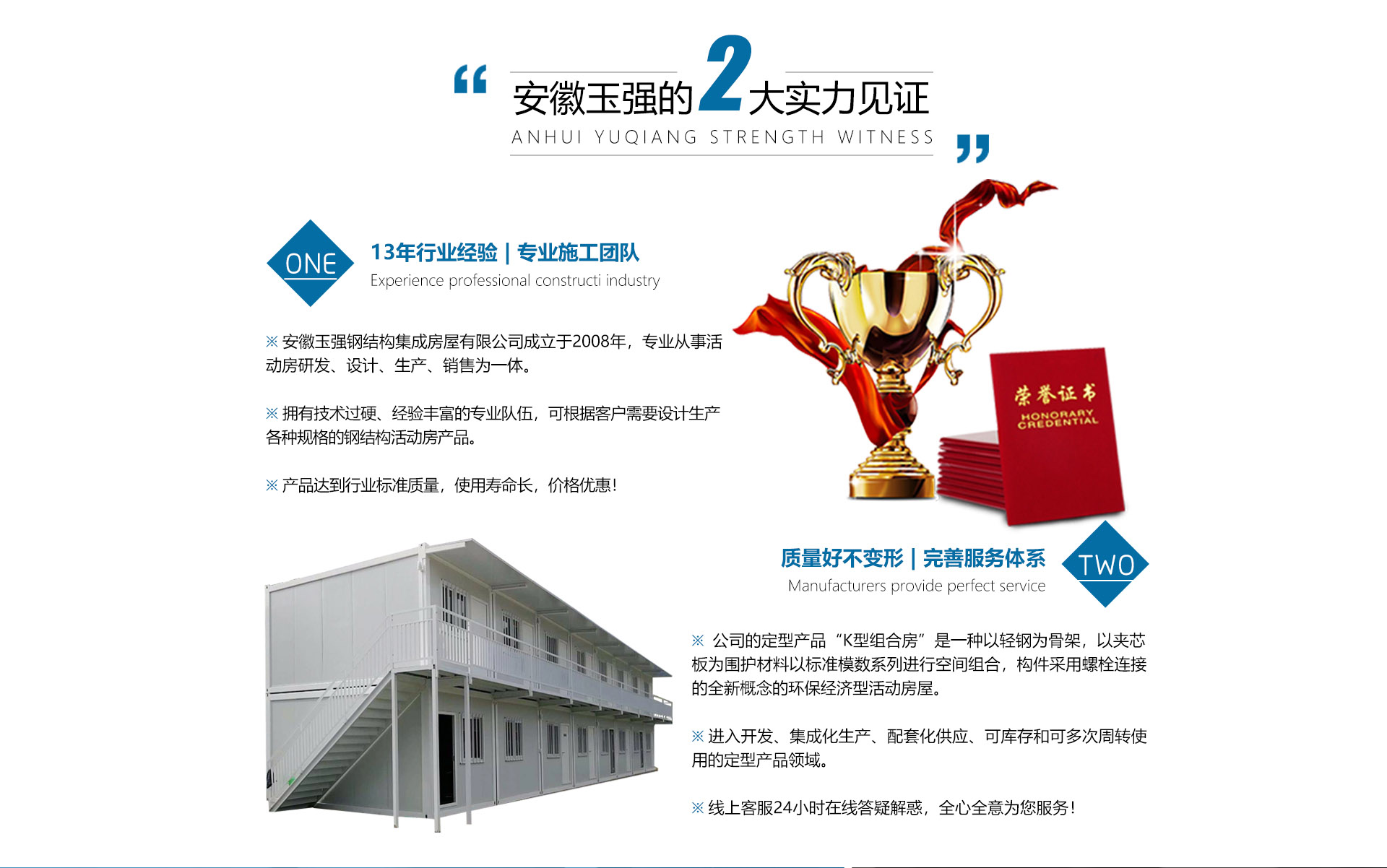 關(guān)于我們安徽玉強鋼結(jié)構(gòu)集成房屋有限公司是一家集研發(fā)、設計、生產(chǎn)、銷售服務于一體的活動房與集裝箱制造企業(yè),公司隊伍具有多年鋼結(jié)構(gòu)制作及產(chǎn)品檢測經(jīng)驗,嚴格按照鋼結(jié)構(gòu)標準要求制作、檢測。致力于提供研、產(chǎn)、銷、于一體,有著多年積累的先進生產(chǎn)技術(shù)和豐富工作經(jīng)驗,采用精良的工藝技術(shù),生產(chǎn)美觀大方的定型產(chǎn)品,長期以來,受廣大用戶的信賴和支持。歡迎您的來電咨詢。